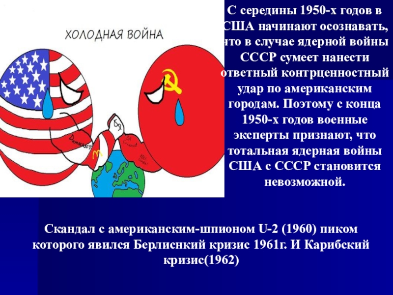 Скандал с американским-шпионом U-2 (1960) пиком которого явился Берлиснкий кризис 1961г. И Карибский кризис(1962)