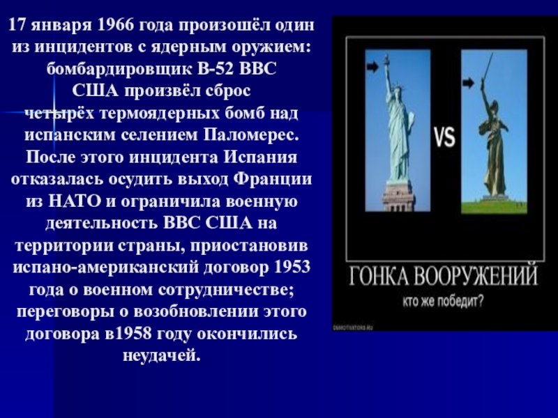 четырёх термоядерных бомб над испанским селением Паломерес. После этого инцидента Испания отказалась осудить выход Франции из НАТО и ограничила военную деятельность ВВС США на территории страны, приостановив испано-американский договор 1953 года о военном сотрудничестве; переговоры о возобновлении этого договора в1958 году окончились неудачей.
