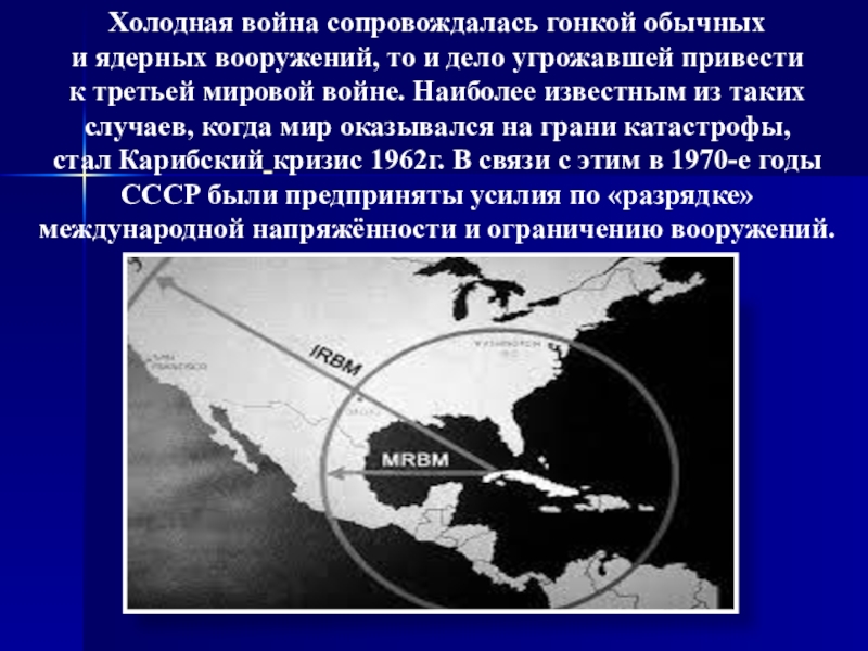 войне. Наиболее известным из таких случаев, когда мир оказывался на грани катастрофы, стал Карибский кризис 1962г. В связи с этим в 1970-е годы СССР были предприняты усилия по «разрядке» международной напряжённости и ограничению вооружений.