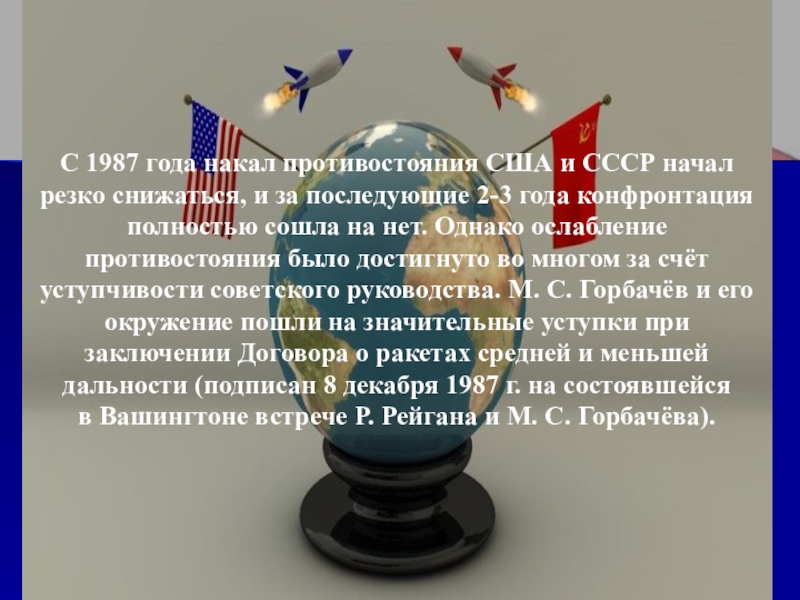 Слайд 15С 1987 года накал противостояния США и СССР начал резко снижаться,