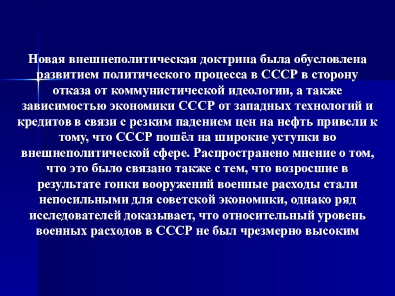 сторону отказа от коммунистической идеологии, а также зависимостью экономики СССР от западных технологий и кредитов в связи с резким падением цен на нефть привели к тому, что СССР пошёл на широкие уступки во внешнеполитической сфере. Распространено мнение о том, что это было связано также с тем, что возросшие в результате гонки вооружений военные расходы стали непосильными для советской экономики, однако ряд исследователей доказывает, что относительный уровень военных расходов в СССР не был чрезмерно высоким