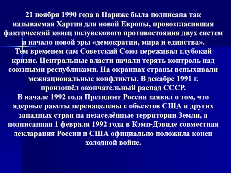 провозгласившая фактический конец полувекового противостояния двух систем и начало новой эры «демократии, мира и единства».
