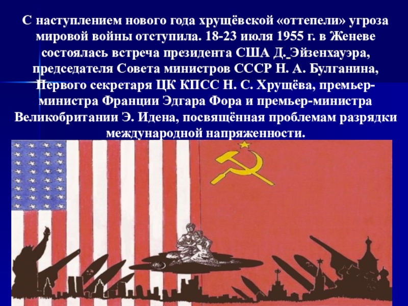 Слайд 6С наступлением нового года хрущёвской «оттепели» угроза мировой войны отступила. 18-23 июля