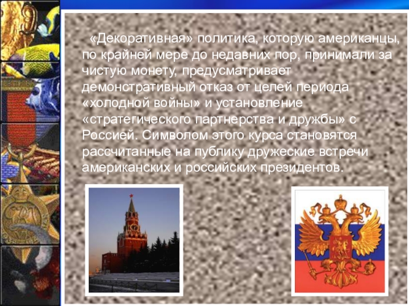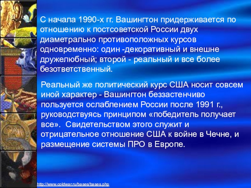 С начала 1990-х гг. Вашингтон придерживается по отношению к постсоветской России двух диаметрально противоположных курсов одновременно: один -декоративный и внешне дружелюбный; второй - реальный и все более безответственный.