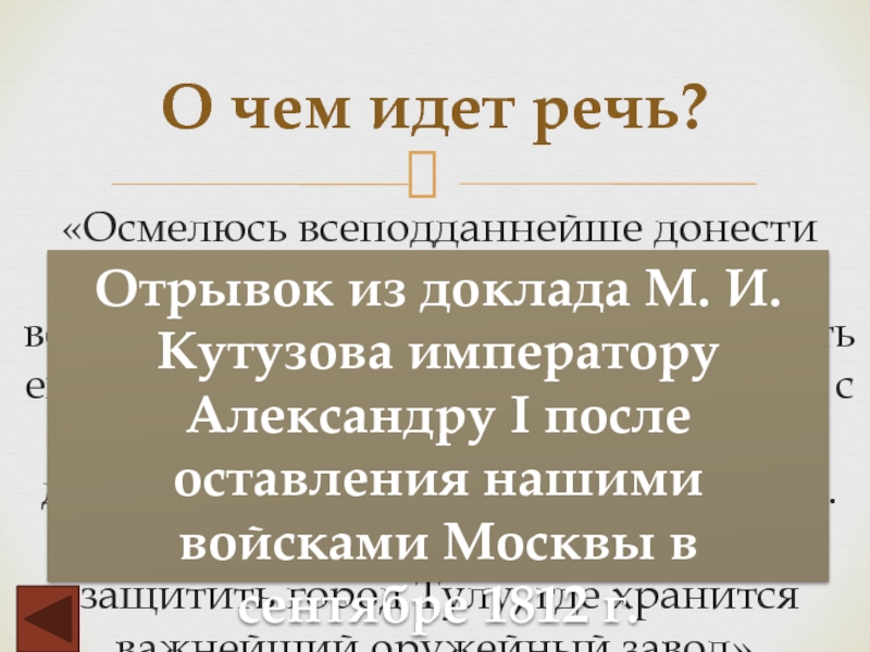 Отрывок из доклада М. И. Кутузова императору Александру I после оставления нашими войсками Москвы в сентябре 1812 г.