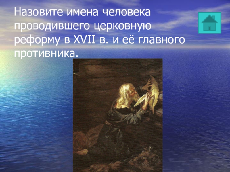 Слайд 25Назовите имена человека проводившего церковную реформу в XVII в. и её