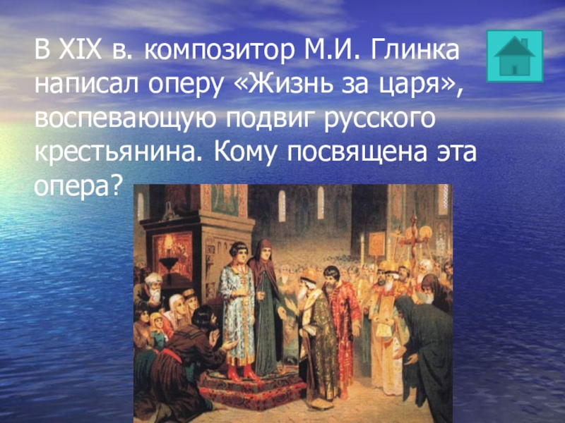 В XIX в. композитор М.И. Глинка написал оперу «Жизнь за царя», воспевающую подвиг русского крестьянина. Кому посвящена