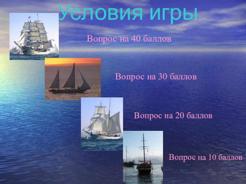 Условия игрыВопрос на 40 балловВопрос на 30 балловВопрос на 10 балловВопрос на 20 баллов