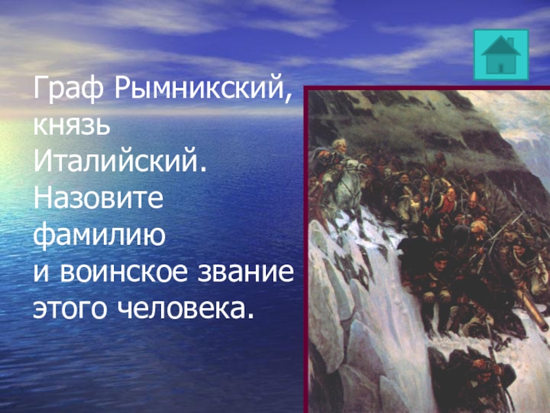 Слайд 23Граф Рымникский, князь Италийский. Назовите фамилию и воинское звание этого человека.