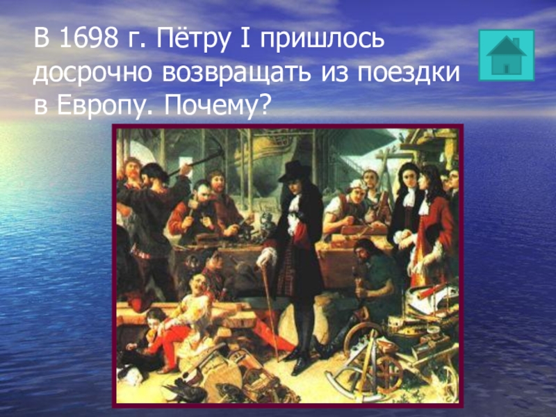 Слайд 16В 1698 г. Пётру I пришлось досрочно возвращать из поездки в