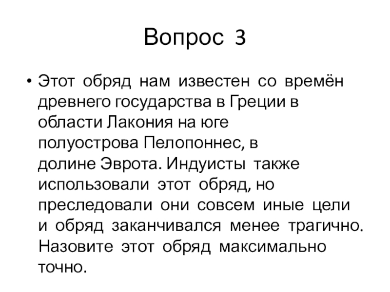 полуострова Пелопоннес, в долине Эврота. Индуисты также использовали этот обряд, но преследовали они совсем иные цели и обряд заканчивался менее трагично. Назовите этот обряд максимально точно.