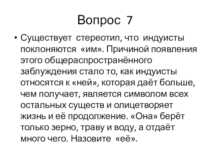 заблуждения стало то, как индуисты относятся к «ней», которая даёт больше, чем получает, является символом всех остальных существ и олицетворяет жизнь и её продолжение. «Она» берёт только зерно, траву и воду, а отдаёт много чего. Назовите «её».