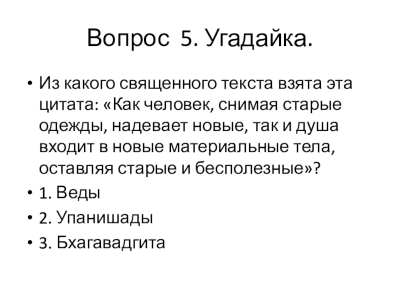 человек, снимая старые одежды, надевает новые, так и душа входит в новые материальные тела, оставляя старые и бесполезные»?