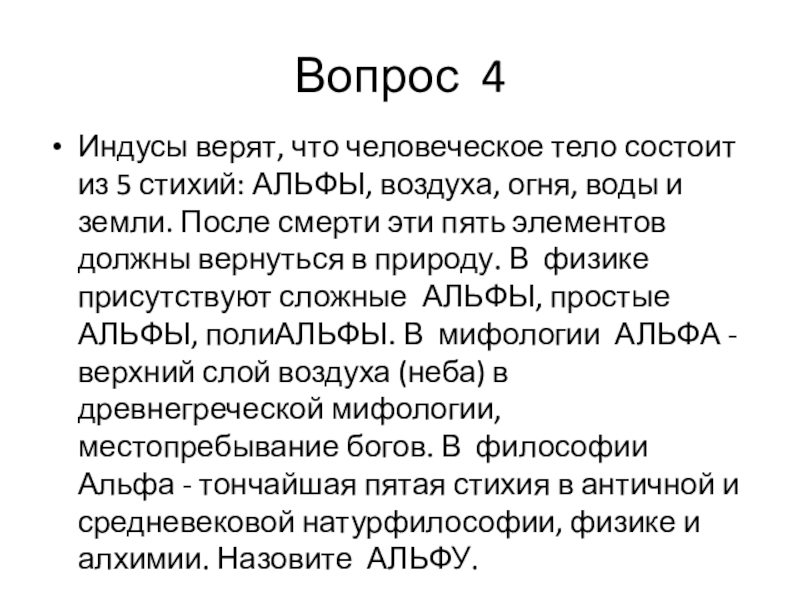 воздуха, огня, воды и земли. После смерти эти пять элементов должны вернуться в природу. В физике присутствуют сложные АЛЬФЫ, простые АЛЬФЫ, полиАЛЬФЫ. В мифологии АЛЬФА - верхний слой воздуха (неба) в древнегреческой мифологии, местопребывание богов. В философии Альфа - тончайшая пятая стихия в античной и средневековой натурфилософии, физике и алхимии. Назовите АЛЬФУ.
