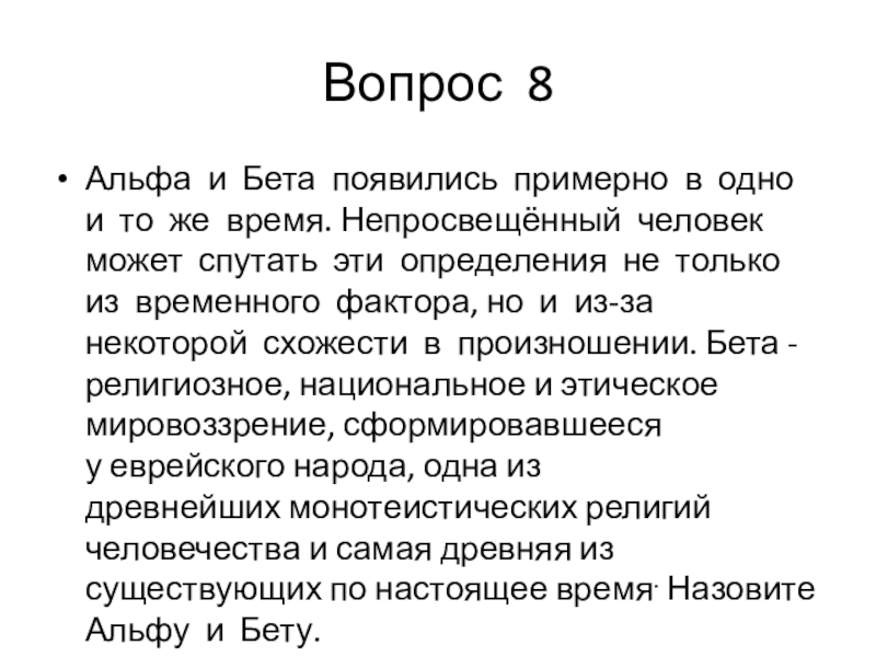 время. Непросвещённый человек может спутать эти определения не только из временного фактора, но и из-за некоторой схожести в произношении. Бета - религиозное, национальное и этическое мировоззрение, сформировавшееся у еврейского народа, одна из древнейших монотеистических религий человечества и самая древняя из существующих по настоящее время. Назовите Альфу и Бету.