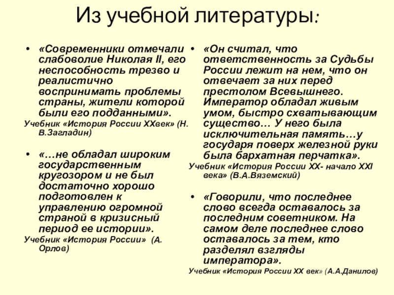 «Он считал, что ответственность за Судьбы России лежит на нем, что он отвечает за них перед престолом Всевышнего. Император обладал живым умом, быстро схватывающим существо… У него была исключительная память…у государя поверх железной руки была бархатная перчатка».