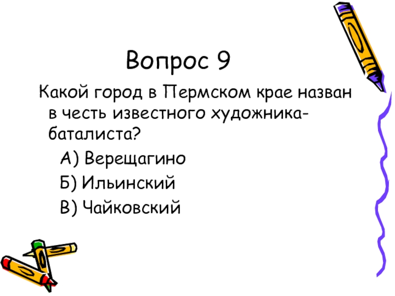 Вопрос 9 Какой город в Пермском крае назван в честь известного художника-баталиста?   А) Верещагино