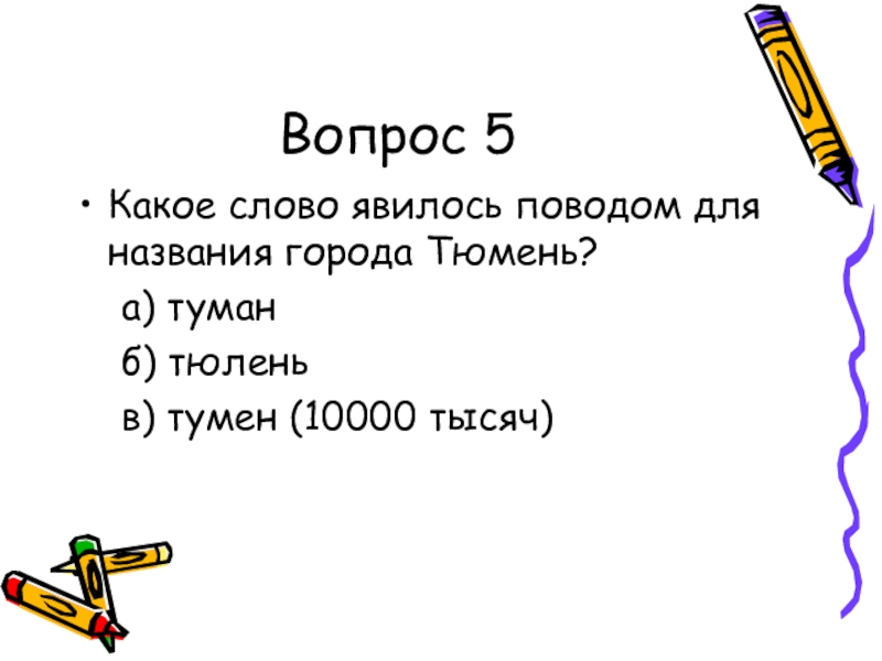 Вопрос 5Какое слово явилось поводом для названия города Тюмень?  а) туман  б) тюлень  в)