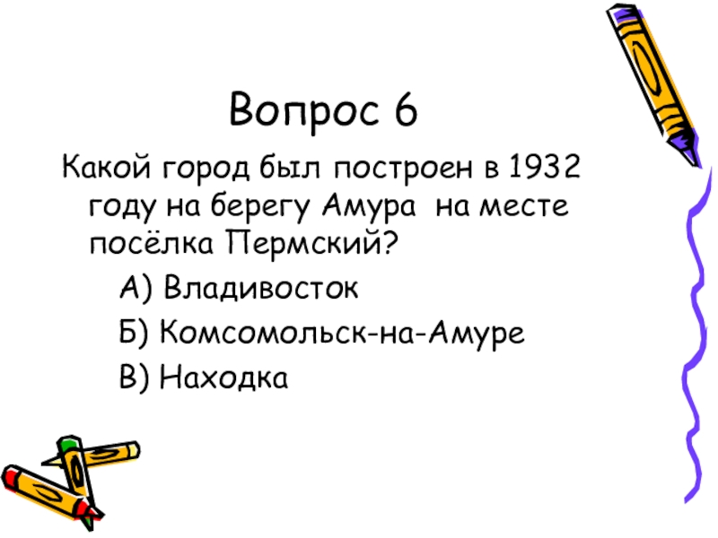 Вопрос 6Какой город был построен в 1932 году на берегу Амура на месте посёлка Пермский?