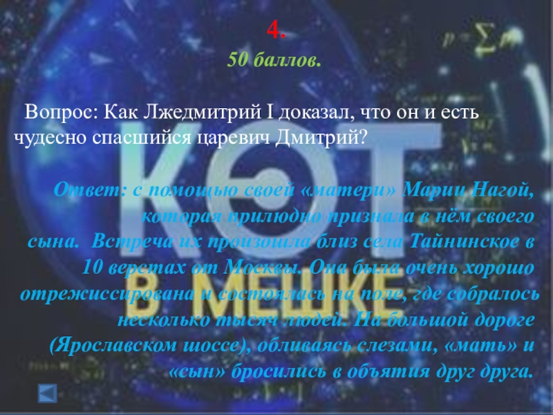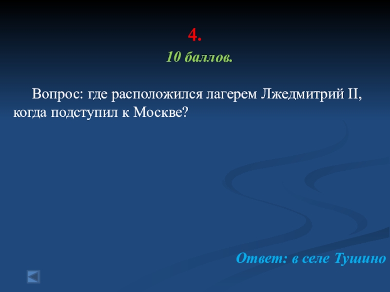 4.  10 баллов.   Вопрос: где расположился лагерем Лжедмитрий II, когда подступил к Москве?Ответ: