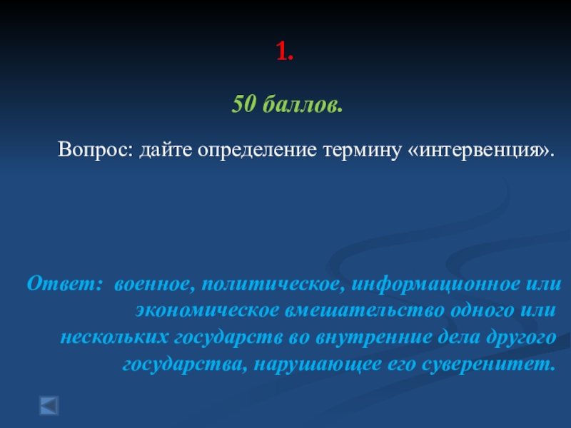 1.  50 баллов.    Вопрос: дайте определение термину «интервенция».Ответ:  военное, политическое, информационное или