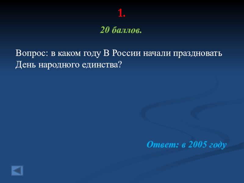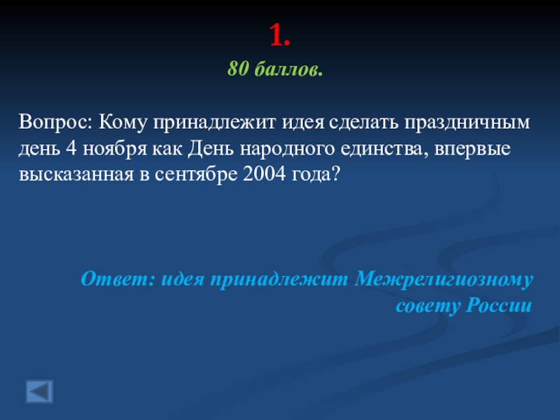 1. 80 баллов. Вопрос: Кому принадлежит идея сделать праздничным день 4 ноября как День народного единства, впервые высказанная в сентябре 2004