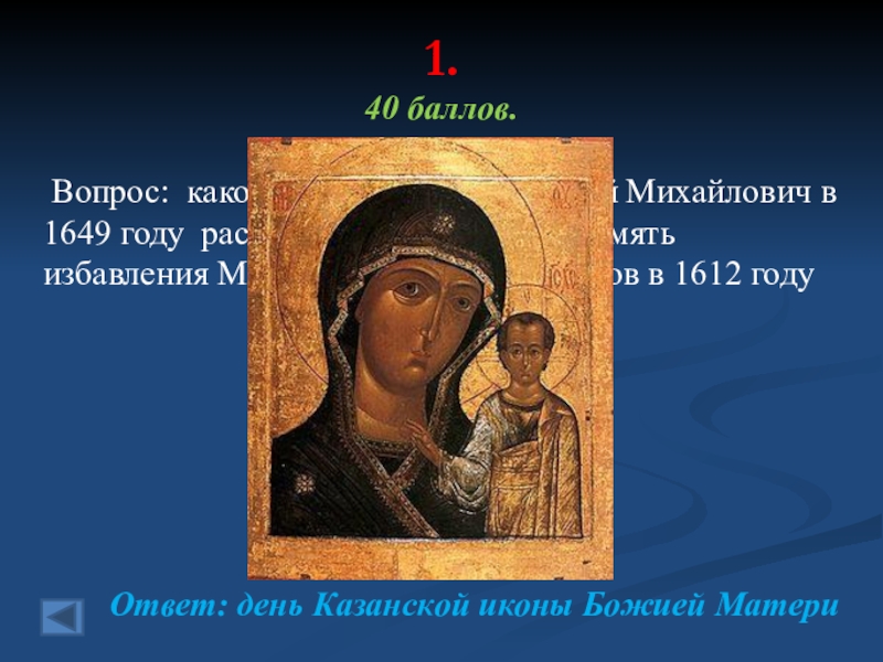 1. 40 баллов. Вопрос:  какой праздник царь Алексей Михайлович в 1649 году  распорядился отмечать в память избавления Москвы и России от поляков в 1612