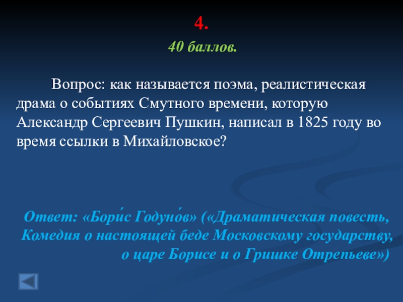 4. 40 баллов.     Вопрос: как называется поэма, реалистическая драма о событиях Смутного времени, которую