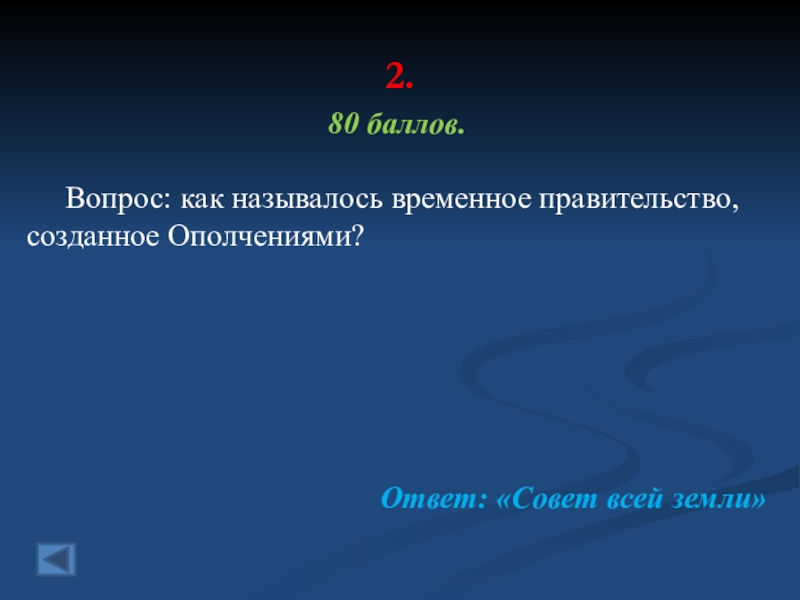 2.80 баллов.   Вопрос: как называлось временное правительство, созданное Ополчениями?Ответ: «Совет всей земли»