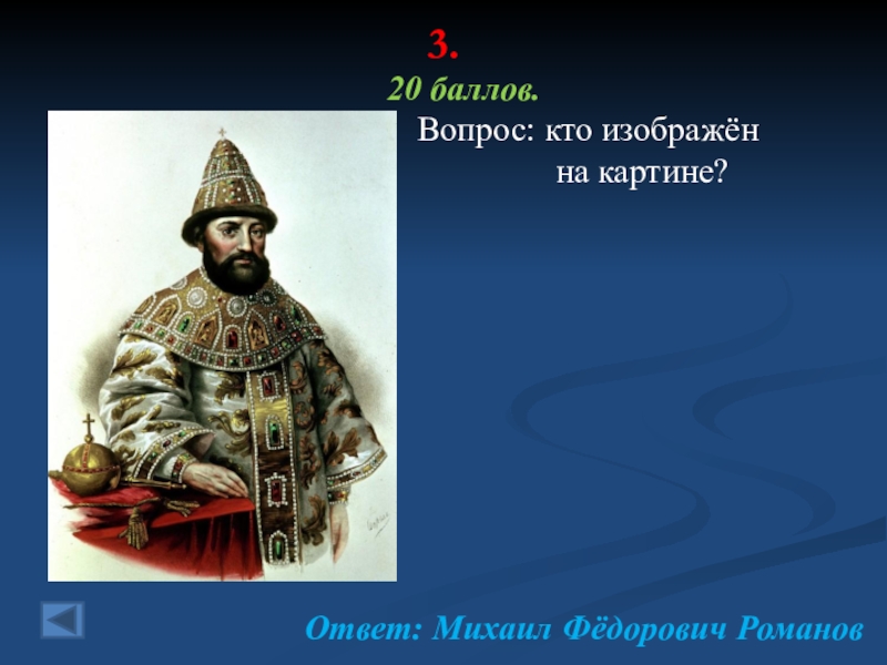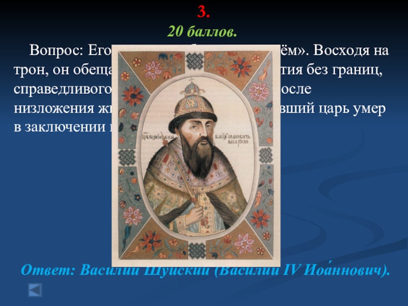 3.  20 баллов.   Вопрос: Его прозвали «боярским царём». Восходя на трон, он обещал не