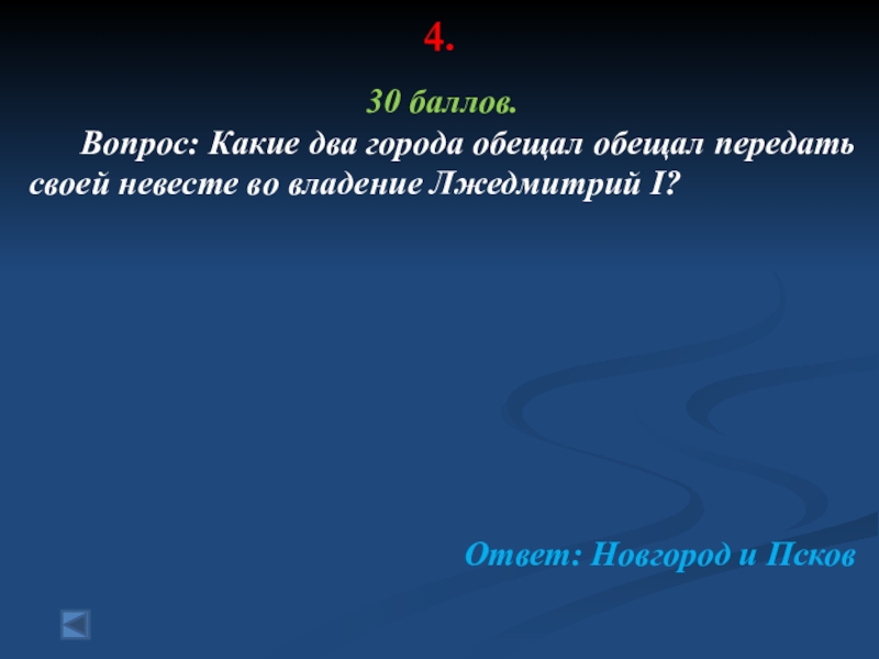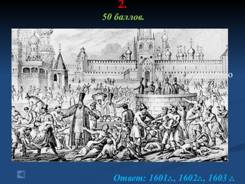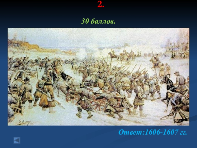 2.  30 баллов.   Вопрос: Назовите годы восстания под предводительством  И. И. Болотникова.Ответ:1606-1607 гг.
