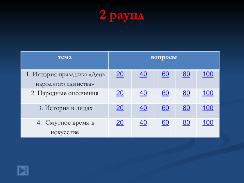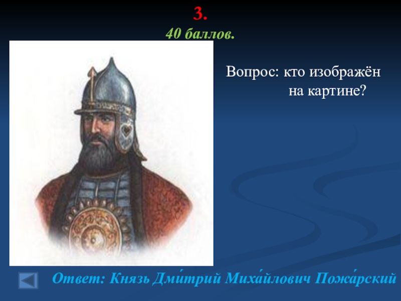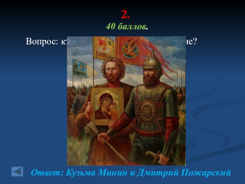 2. 40 баллов. Вопрос: кто возглавил Второе ополчение? Ответ: Кузьма Минин и Дмитрий Пожарский