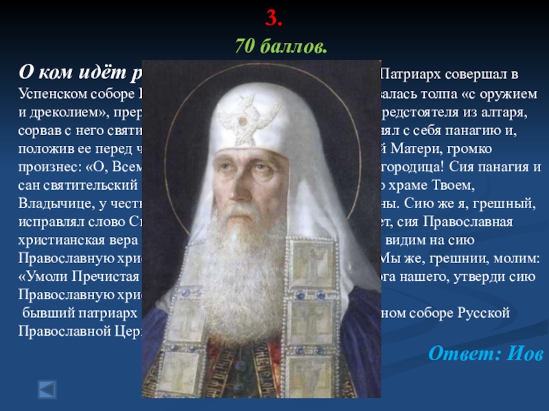 3.  70 баллов.О ком идёт речь: В то время, когда Святейший Патриарх совершал в Успенском соборе