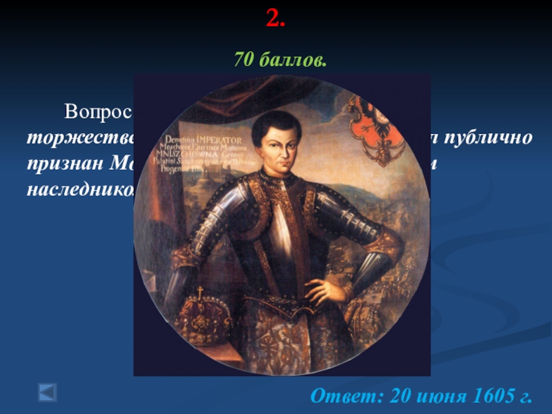 2.  70 баллов.    Вопрос: в каком году Лжедмитрий I торжественно вступил в столицу,
