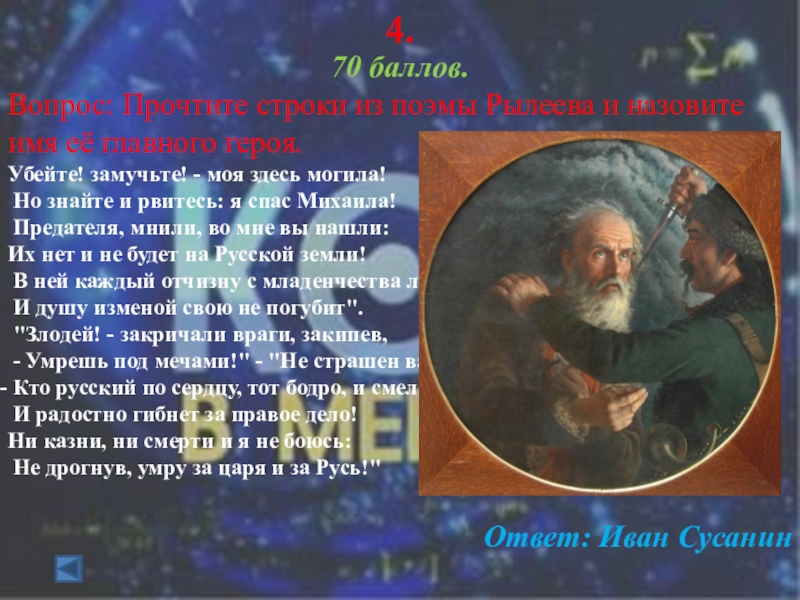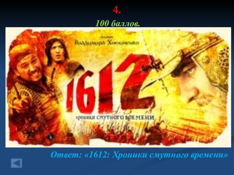 4. 100 баллов. Вопрос: назовите российский приключенческий фильм Владимира Хотиненко, фоном для сюжета которого являются события Смуты. (дата выхода в