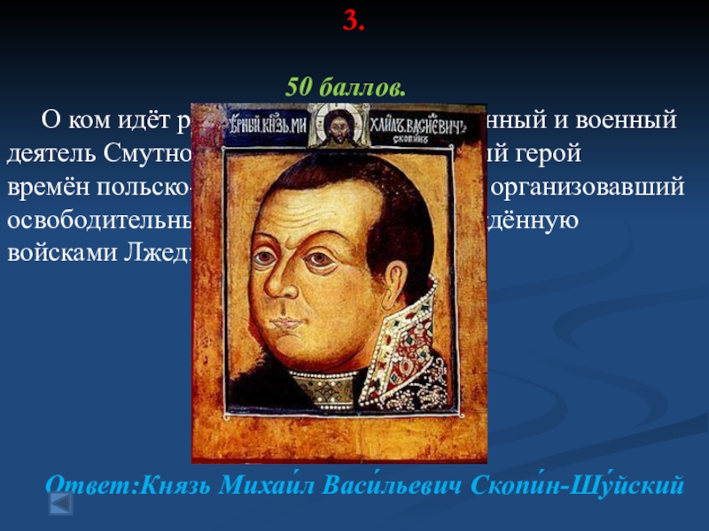 3.  50 баллов.   О ком идёт речь: русский государственный и военный деятель Смутного времени, национальный