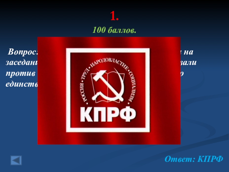 1.100 баллов. Вопрос: члены какой политической партии на заседании Государственной думы проголосовали против принятия праздника День народного