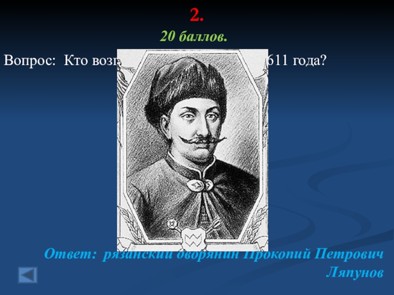 2. 20 баллов. Вопрос:  Кто возглавил 1-е Ополчение 1611 года?  Ответ:  рязанский дворянин Прокопий Петрович Ляпунов