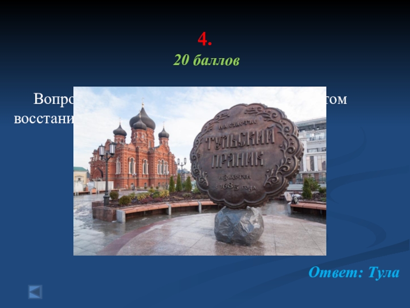4. 20 баллов   Вопрос: Какой город стал последним оплотом восстания Ивана Болотникова?Ответ: Тула