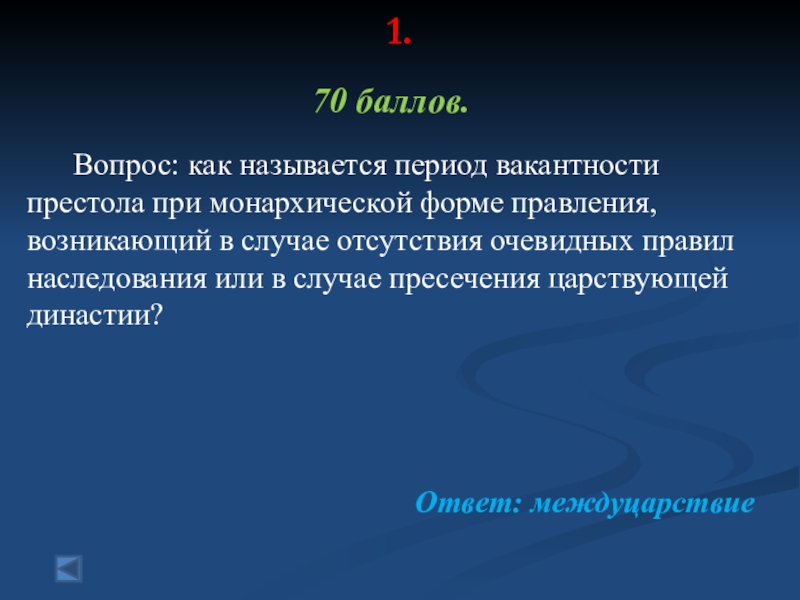 1.  70 баллов.    Вопрос: как называется период вакантности престола при монархической форме