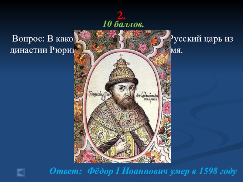 2.10 баллов. Вопрос: В каком году умер последний Русский царь из династии Рюриковичей? Назовите его имя.Ответ:  Фёдор