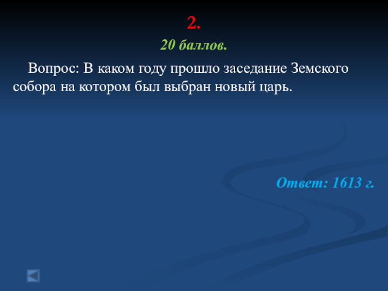 2.  20 баллов.   Вопрос: В каком году прошло заседание Земского собора на котором был