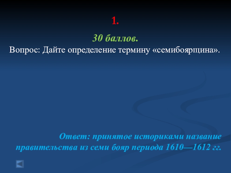 1. 30 баллов. Вопрос: Дайте определение термину «семибоярщина».Ответ: принятое историками название правительства из семи бояр периода 1610—1612 гг.