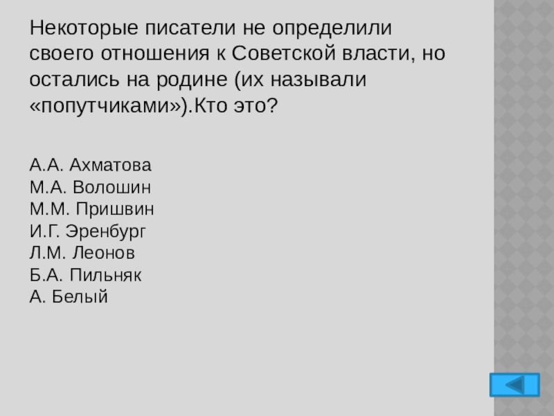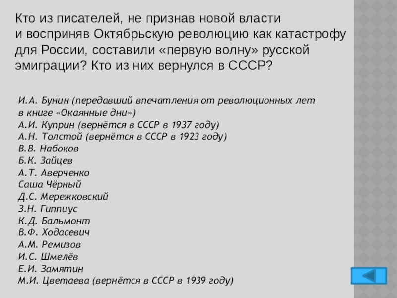 А.Н. Толстой (вернётся в СССР в 1923 году)