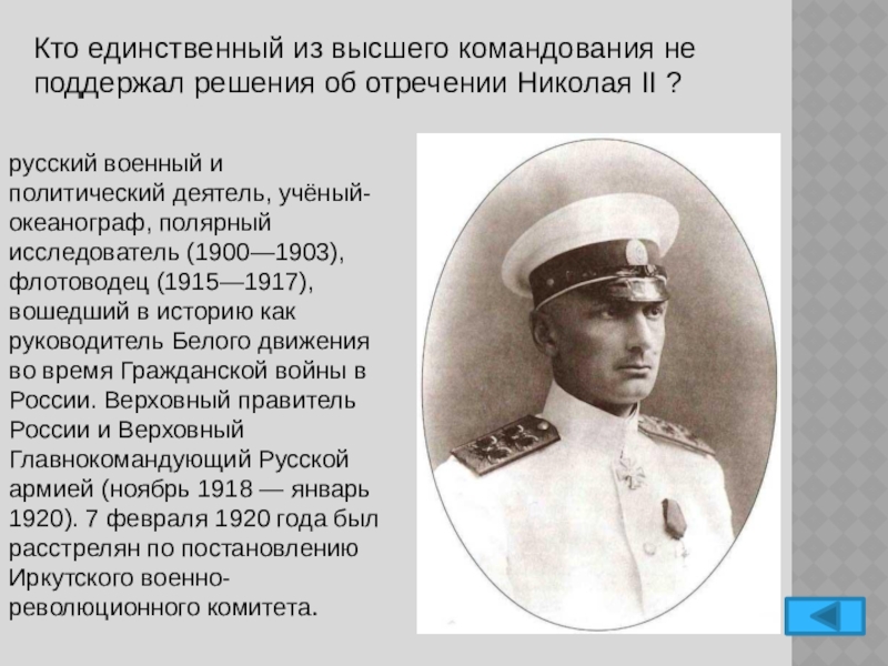 русский военный и политический деятель, учёный-океанограф, полярный исследователь (1900—1903), флотоводец (1915—1917), вошедший в историю как руководитель Белого движения во время Гражданской войны в России. Верховный правитель России и Верховный Главнокомандующий Русской армией (ноябрь 1918 — январь 1920). 7 февраля 1920 года был расстрелян по постановлению Иркутского военно-революционного комитета.