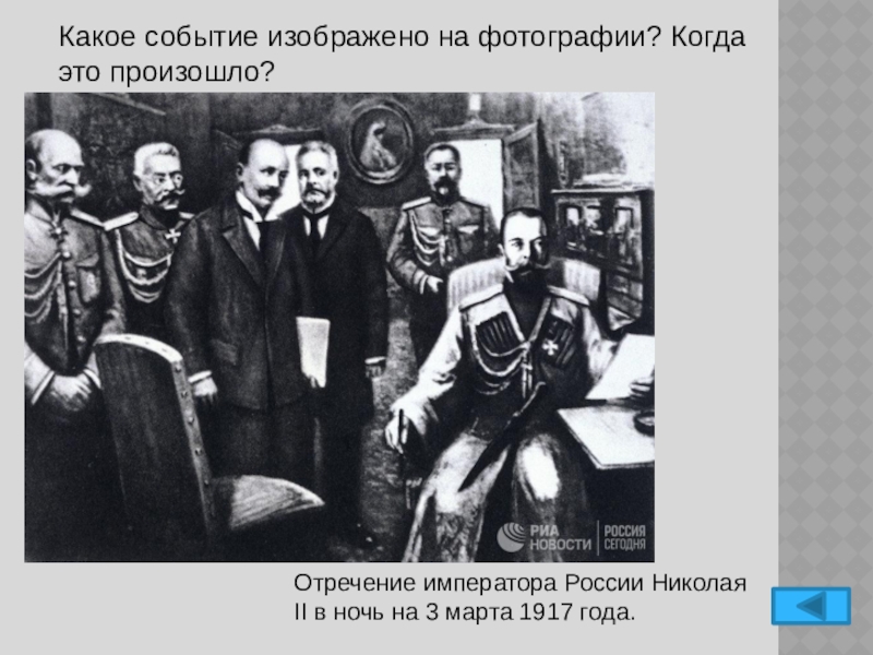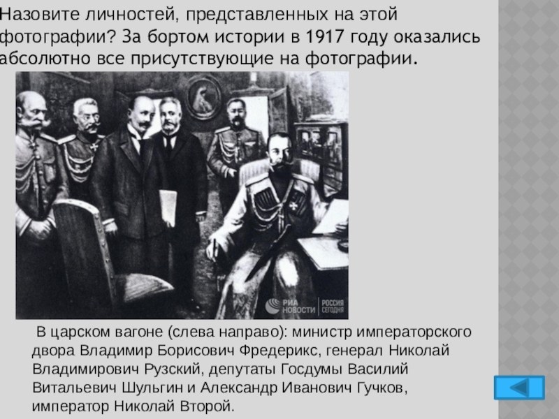 В царском вагоне (слева направо): министр императорского двора Владимир Борисович Фредерикс, генерал Николай Владимирович Рузский, депутаты Госдумы Василий Витальевич Шульгин и Александр Иванович Гучков, император Николай Второй.