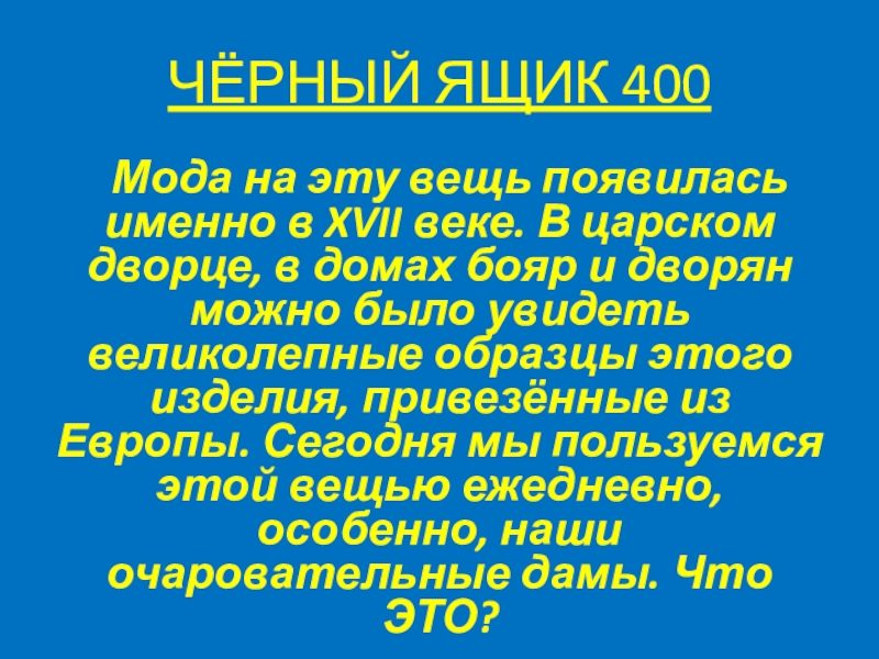 веке. В царском дворце, в домах бояр и дворян можно было увидеть великолепные образцы этого изделия, привезённые из Европы. Сегодня мы пользуемся этой вещью ежедневно, особенно, наши очаровательные дамы. Что ЭТО?