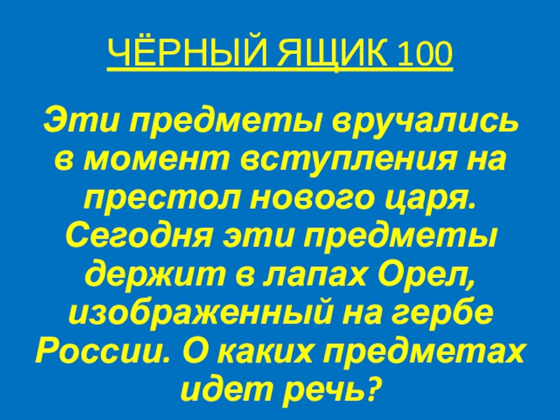 царя. Сегодня эти предметы держит в лапах Орел, изображенный на гербе России. О каких предметах идет речь?