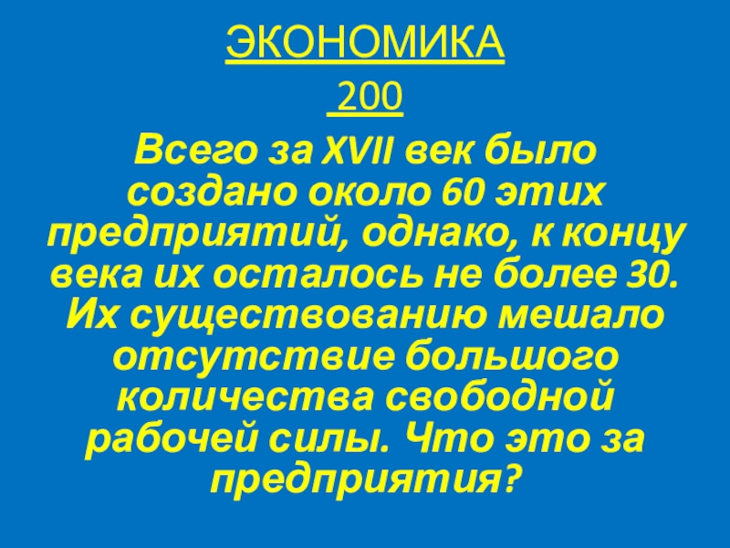 однако, к концу века их осталось не более 30. Их существованию мешало отсутствие большого количества свободной рабочей силы. Что это за предприятия?