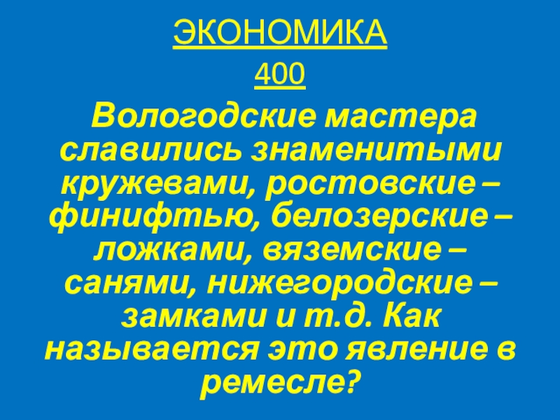 ложками, вяземские – санями, нижегородские – замками и т.д. Как называется это явление в ремесле?